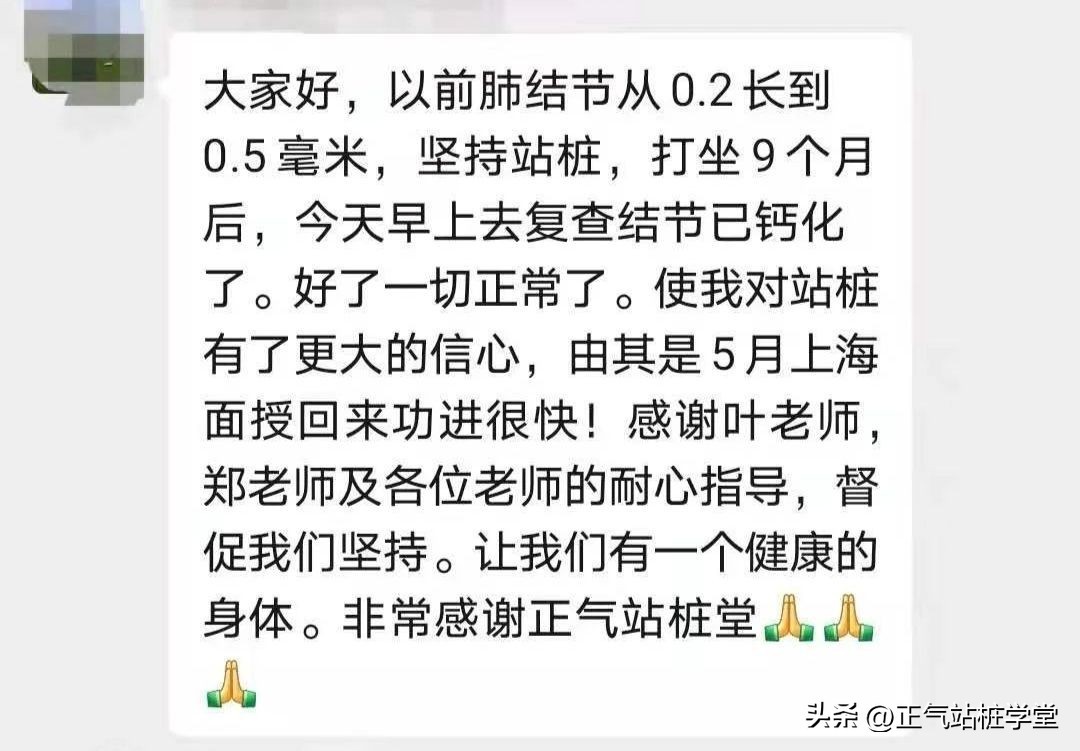 同期,还有学中医的站桩会员说她站桩打坐9个月后,体检发现原来0.5毫米的肺结节已钙化。