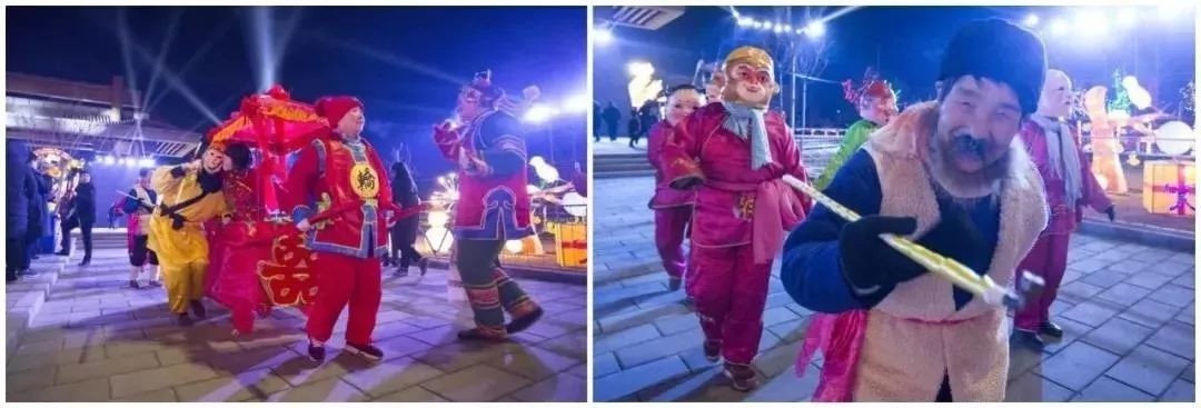 同时亮相的还有承载着年味的民俗扮玩,有秧歌、旱船、毛驴、花篮、丑角、锣鼓队还有锣鼓展演舞龙舞狮等。