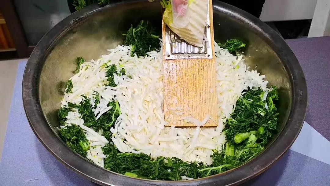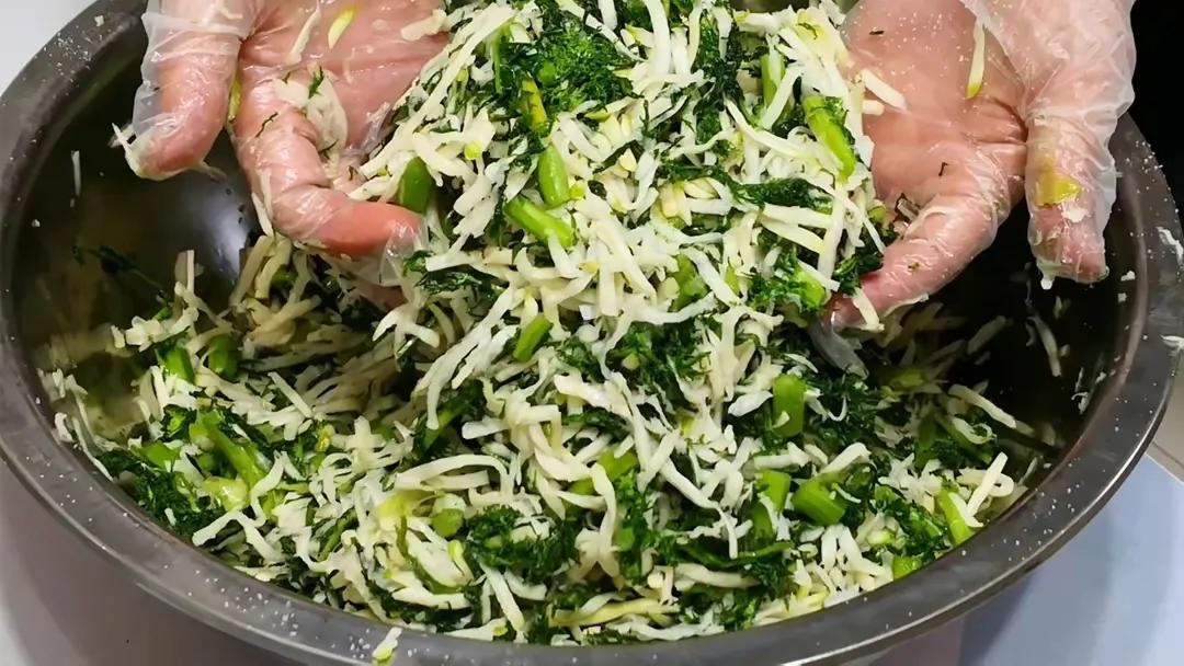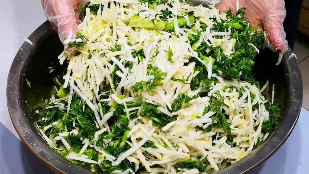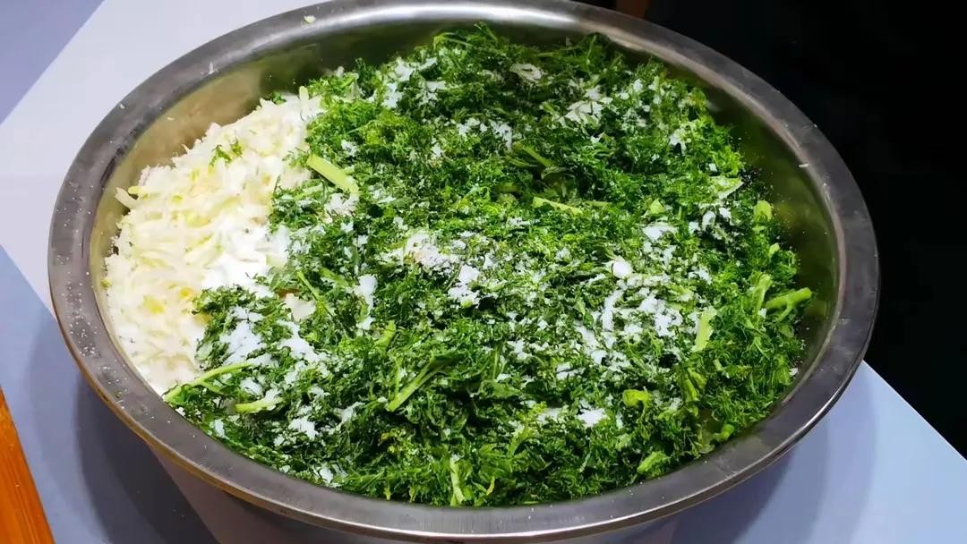 把切好的青菜放入一个大碗中,撒上适量的食盐,轻轻揉搓一会儿。盐不仅能帮助菜叶去除水分,还能让菜更加脆爽。腌制20分钟后,用清水将菜叶洗净,稍微挤去多余的水分,避免腌出来的菜水分过多。