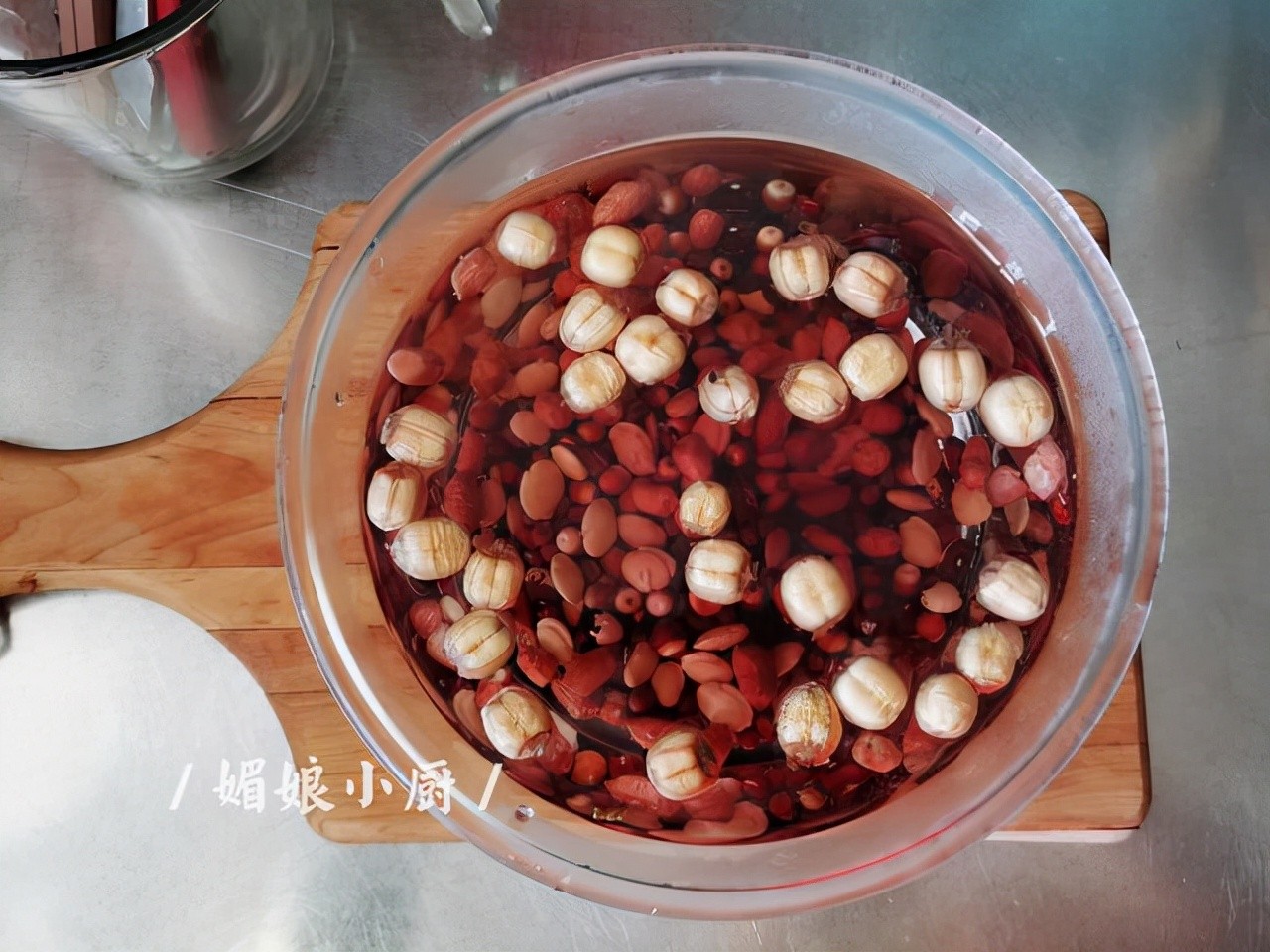 1、红豆,莲子,白芸豆,熊猫豆,花生米,芡实,黑米混合淘洗,装入大碗里,加入500克净水,浸泡一晚