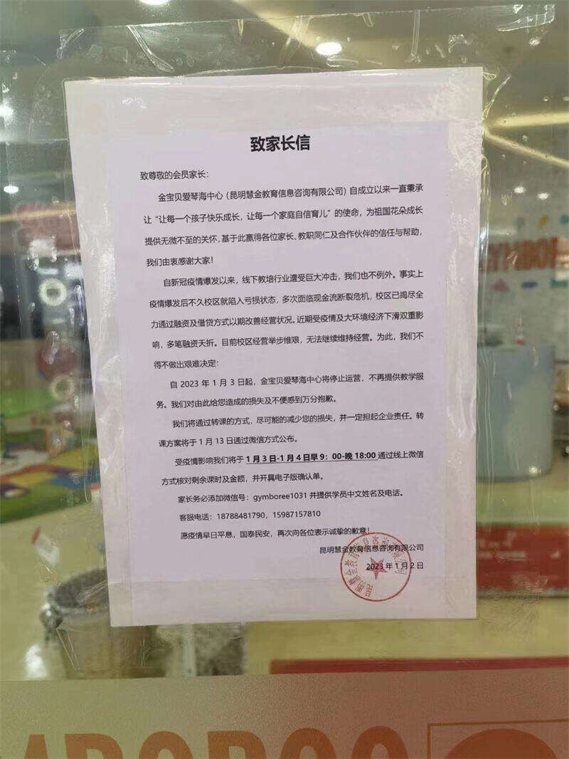 1月3日,有市民向记者反映称,知名早教机构金宝贝一夜之间关门了,自己还剩1万多元的课包没有消费。记者走访发现,1月3日起,昆明金宝贝的4个门店已全部关闭。昆明金宝贝控股公司营运负责人回应,1月3日开始统计剩余课程及金额,1月13日将给出具体处理方案。