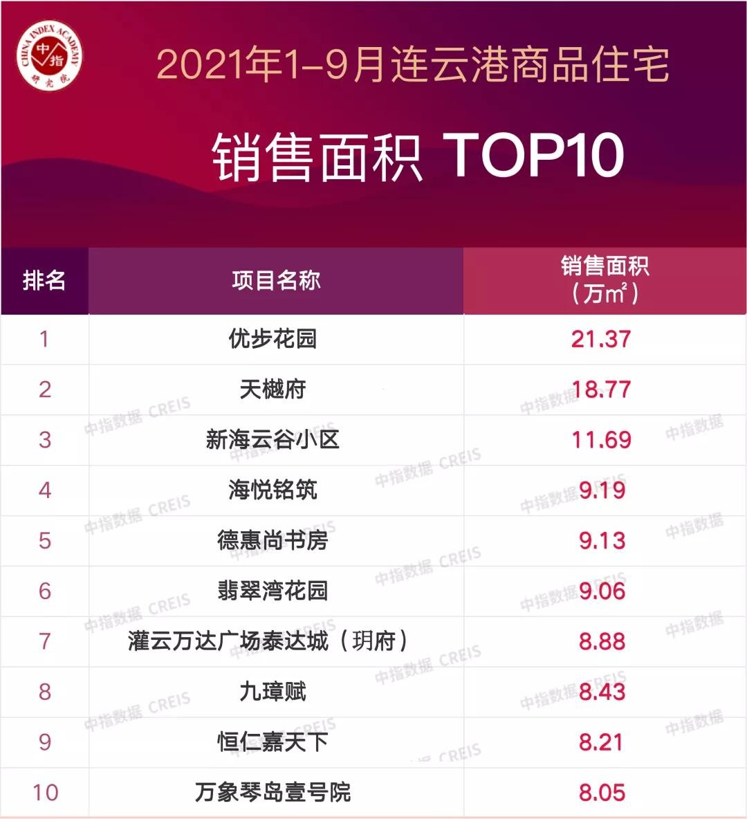 2021年1-9月连云港商品住宅销售面积TOP10