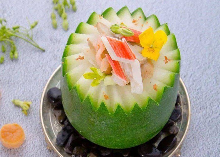 八宝冬瓜盅是一道色香味俱全的特色名菜,特别之处在于厨师会在冬瓜盅的外皮上雕刻各种图案花纹,在品尝味道之余,使人赏心悦目。