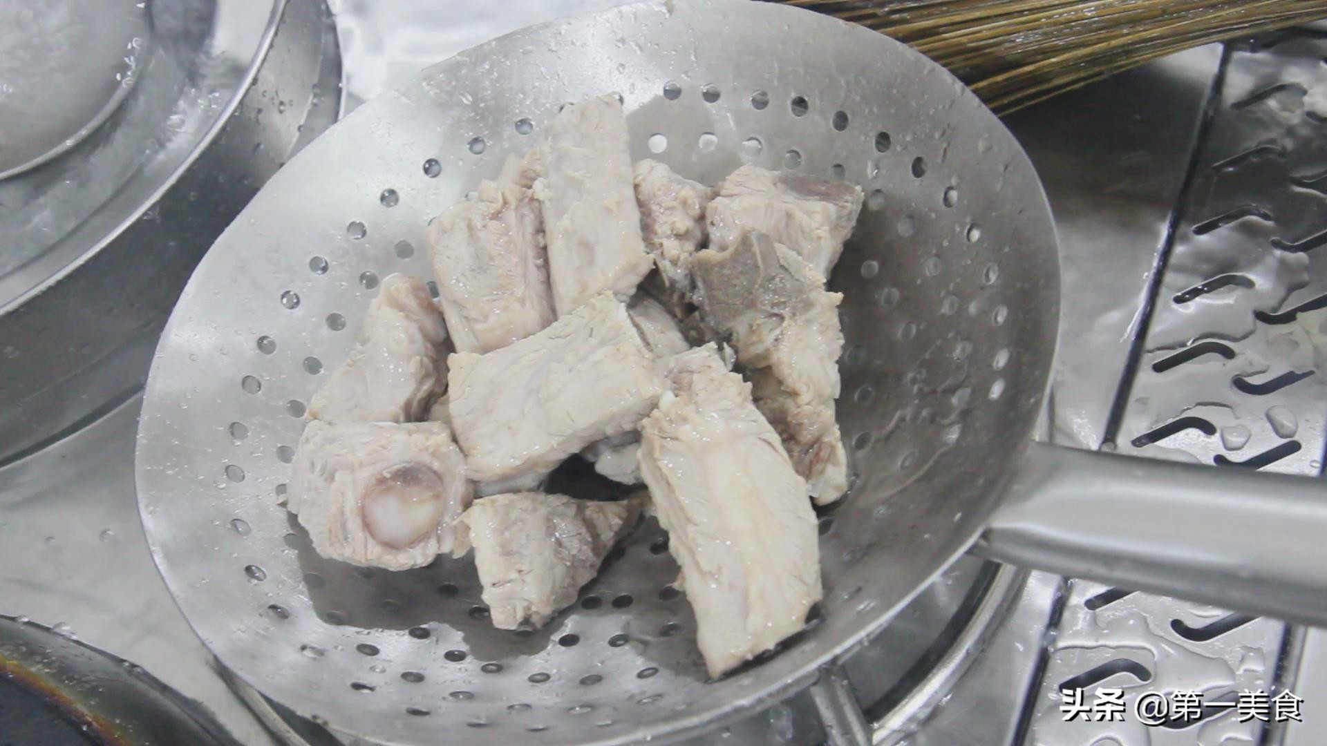 锅中烧水,排骨凉水下锅,倒入料酒去腥,水开之后,煮一分钟,打去浮沫,捞出之后,用清水冲洗干净。