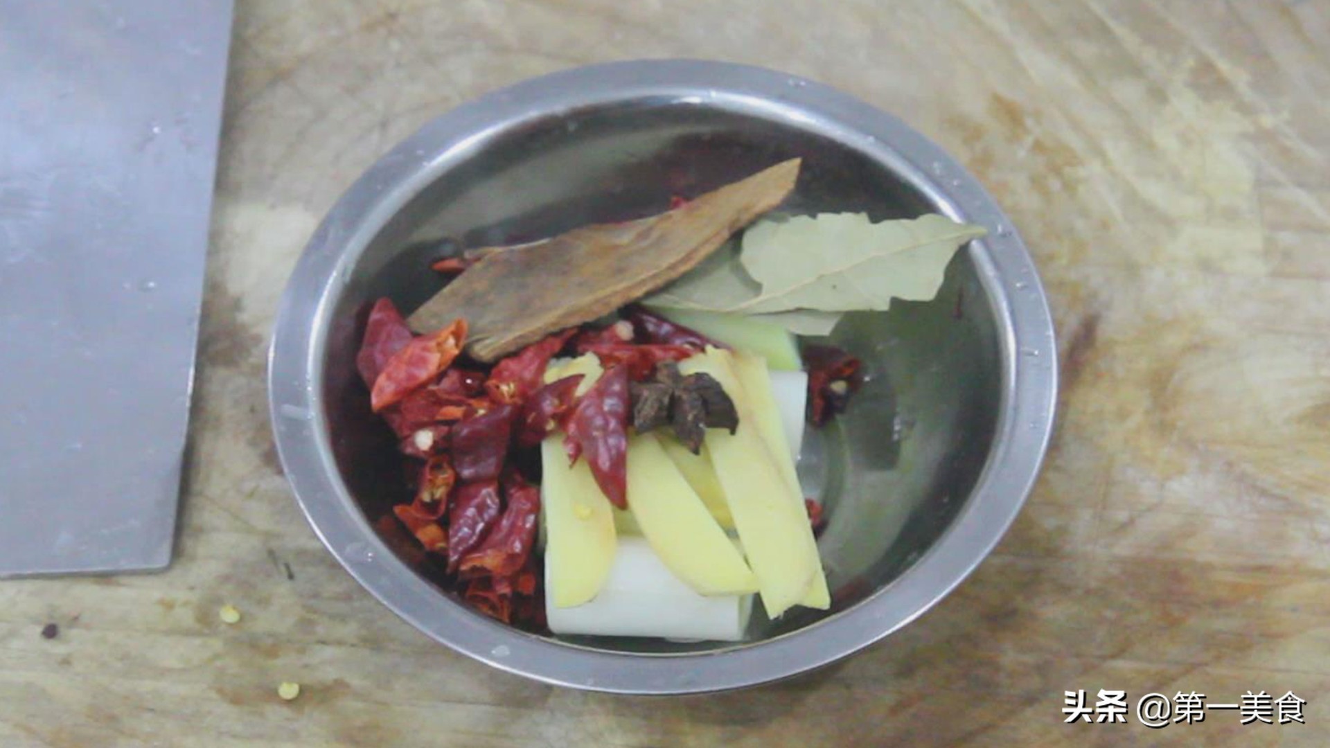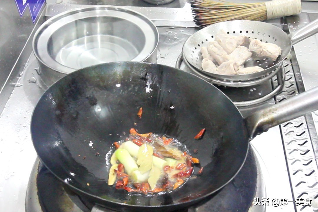准备大葱白一段,切成四小段,然后轻轻拍扁,大茴(八角)一个,花椒一小把,红干椒一小把,香叶两片,桂皮一片。