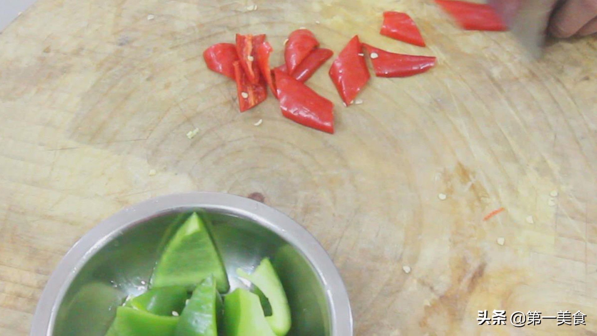 在等待的过程中,取青柿子椒半个,切成三角片,红尖椒两个,切成片。