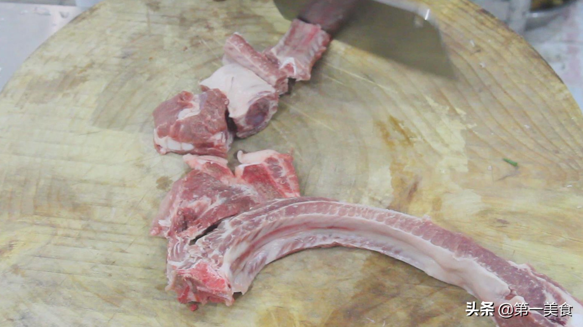 准备猪肋排两根,清洗干净之后,剁成小段。