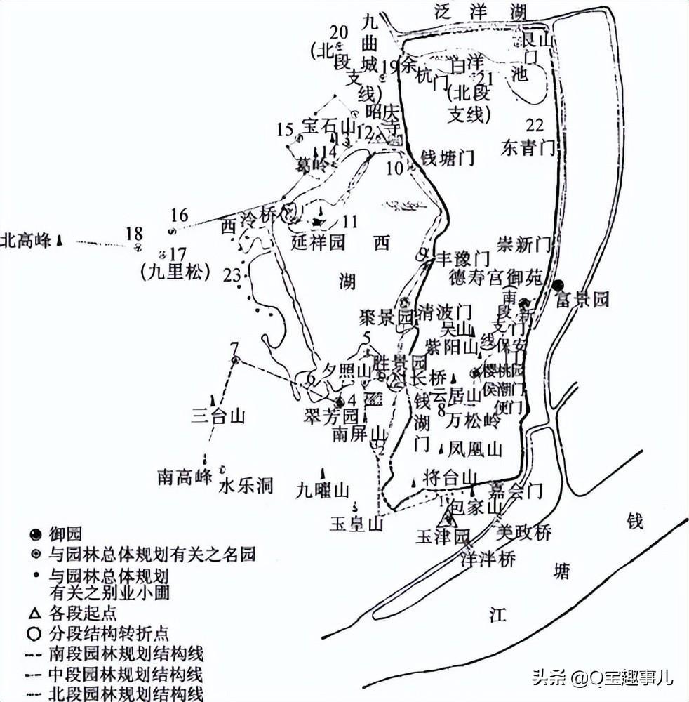 ⑦园林城市:南宋历代帝王推崇自然湖山之美,醉心于优美的园林景观,临安城逐步建设成了山水园林式城市,城市不仅与优美的风景区相结合,还有许多园林点缀其间(详见下图)。