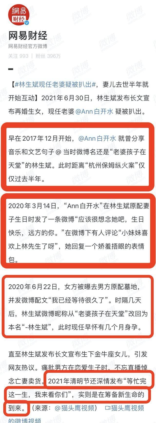据网易财经报道,林生斌现任妻子的微博账号“安开水”疑似被扒。