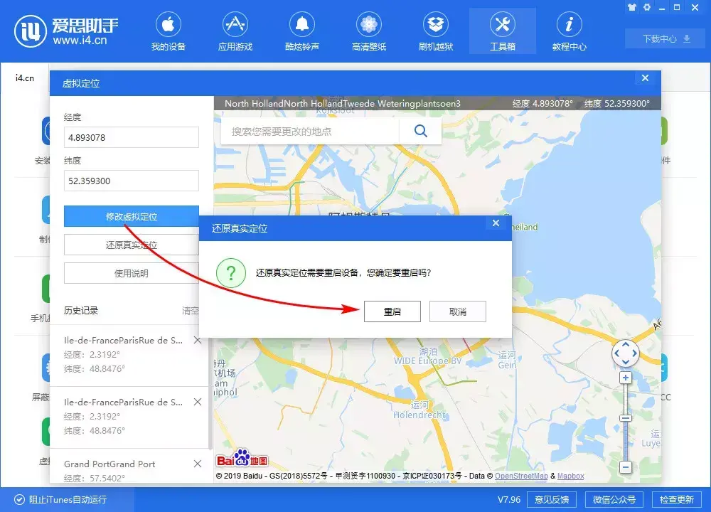 如果需要还原真实定位,如下图点击“还原真实定位”按钮并“重启手机”即可