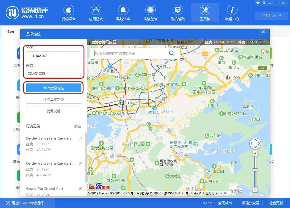 如果想定位到更精准的位置,还可以输入经纬度,再点击“修改虚拟定位”按钮即可