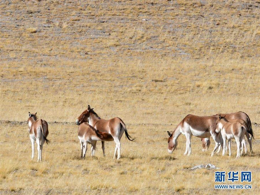 10月30日,在青海省果洛藏族自治州玛多县境内,一群藏野驴在觅食。 新华社记者 张龙 摄