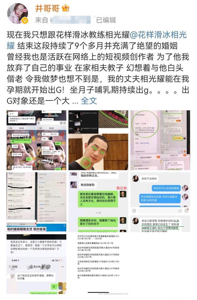井哥哥发文表示“现在只想很花样滑冰教练相光耀结束这段持续了9个多月并充满了绝望的婚姻,丈夫在我孕期就开始出轨,坐月子哺乳期持续出轨,出轨对象还是一个大三女生”。
