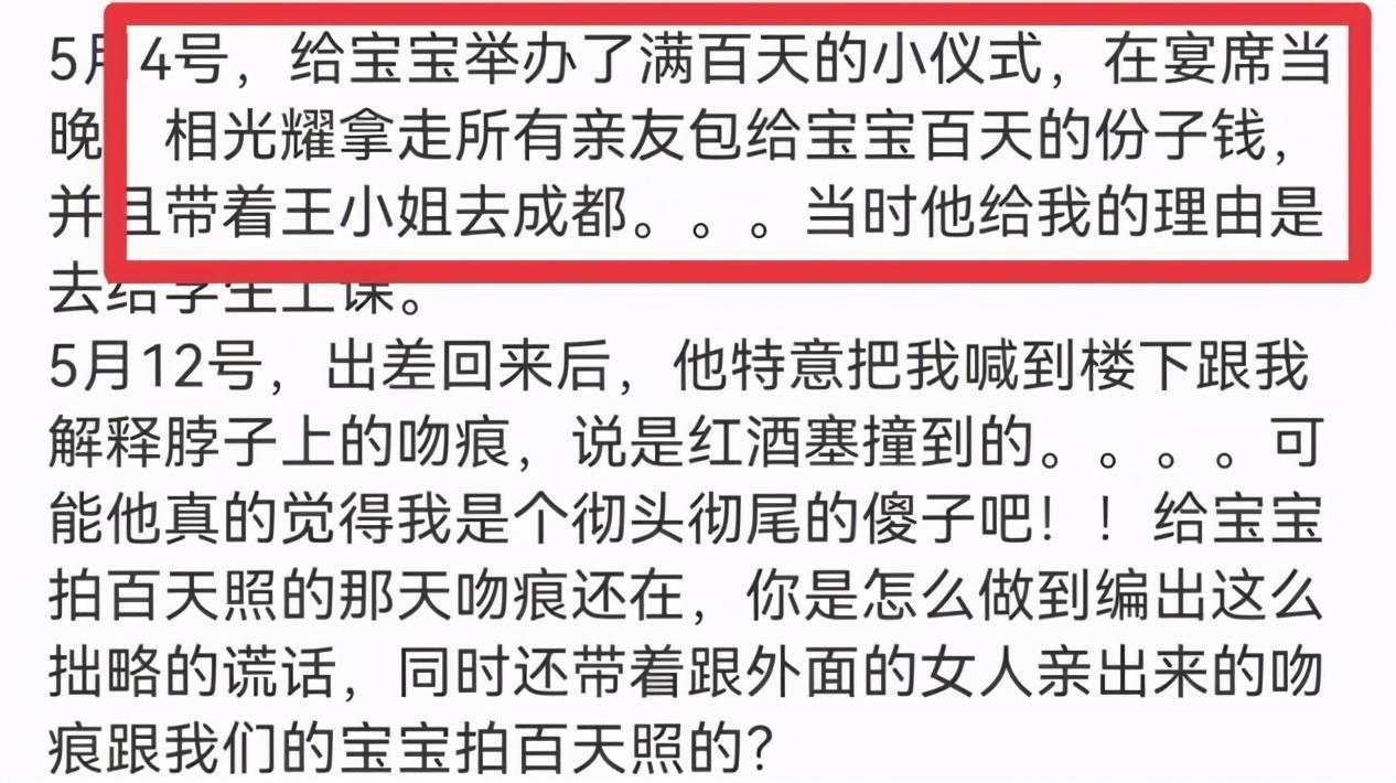 除此以外,相光耀的妻子还表示老公带着别的女人的吻痕来给儿子拍白天照,这一系列的举动都让她感觉伤心不已。