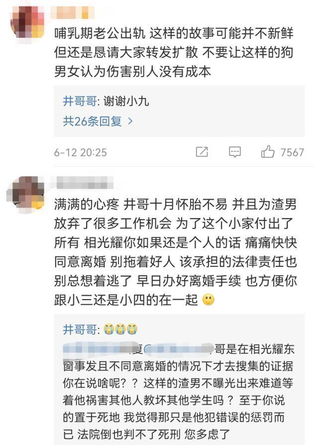 很多网友看到这段消息后留言道“哺乳期老公出轨,这样的故事可能并不新鲜,不要让这样的人认为伤害别人没有成本”,还有网友表示“相光耀你如果还是个男人,痛痛快快离婚”。