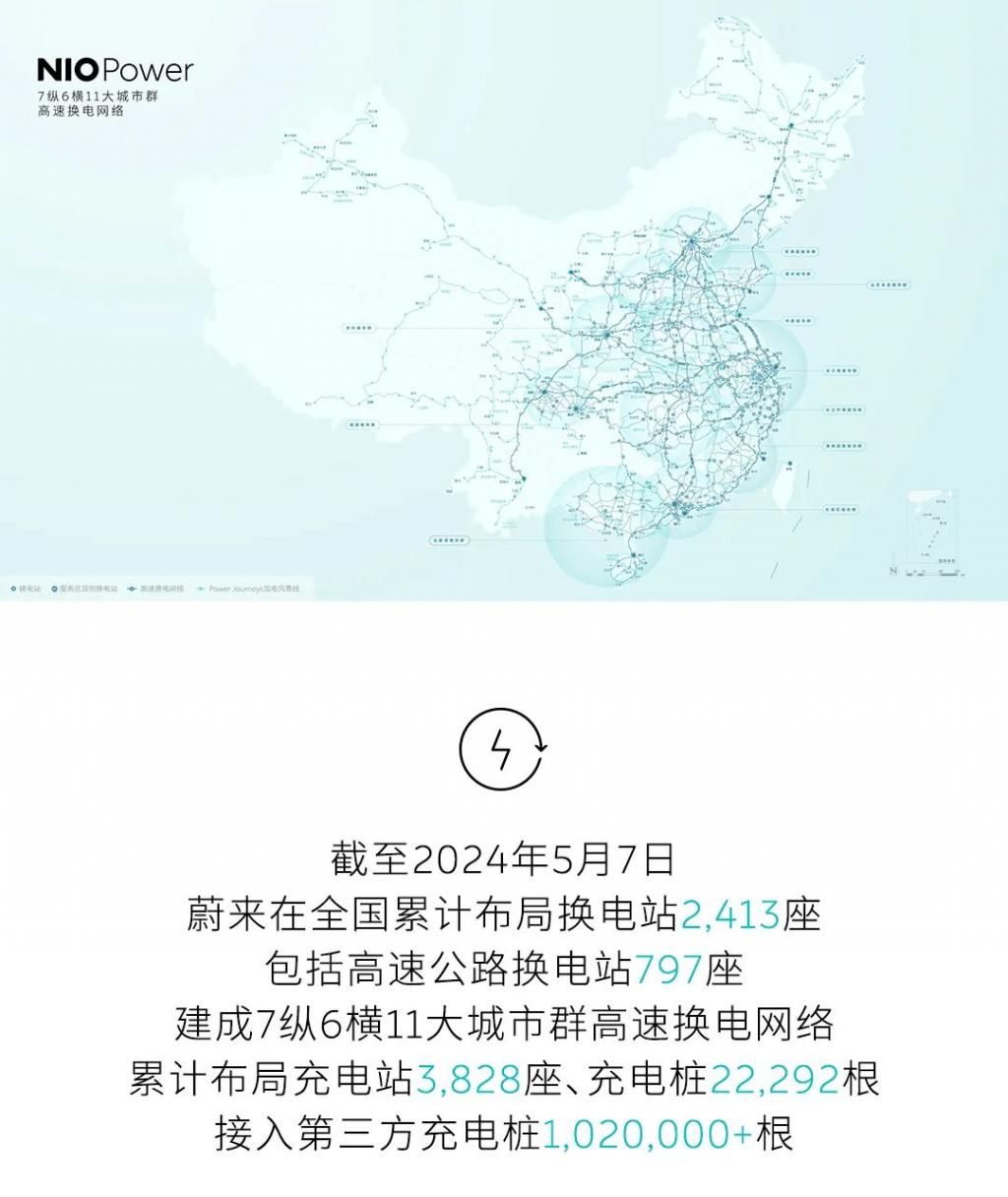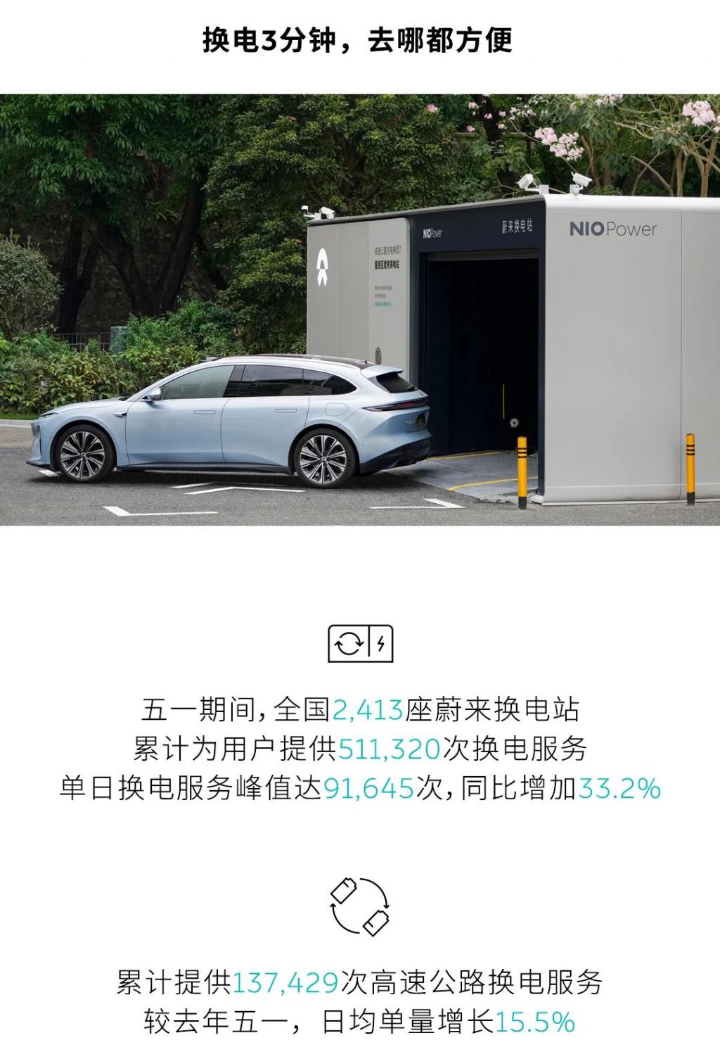蔚来发布 2024 五一假期用户加电报告:提供超 51 万次换电服务