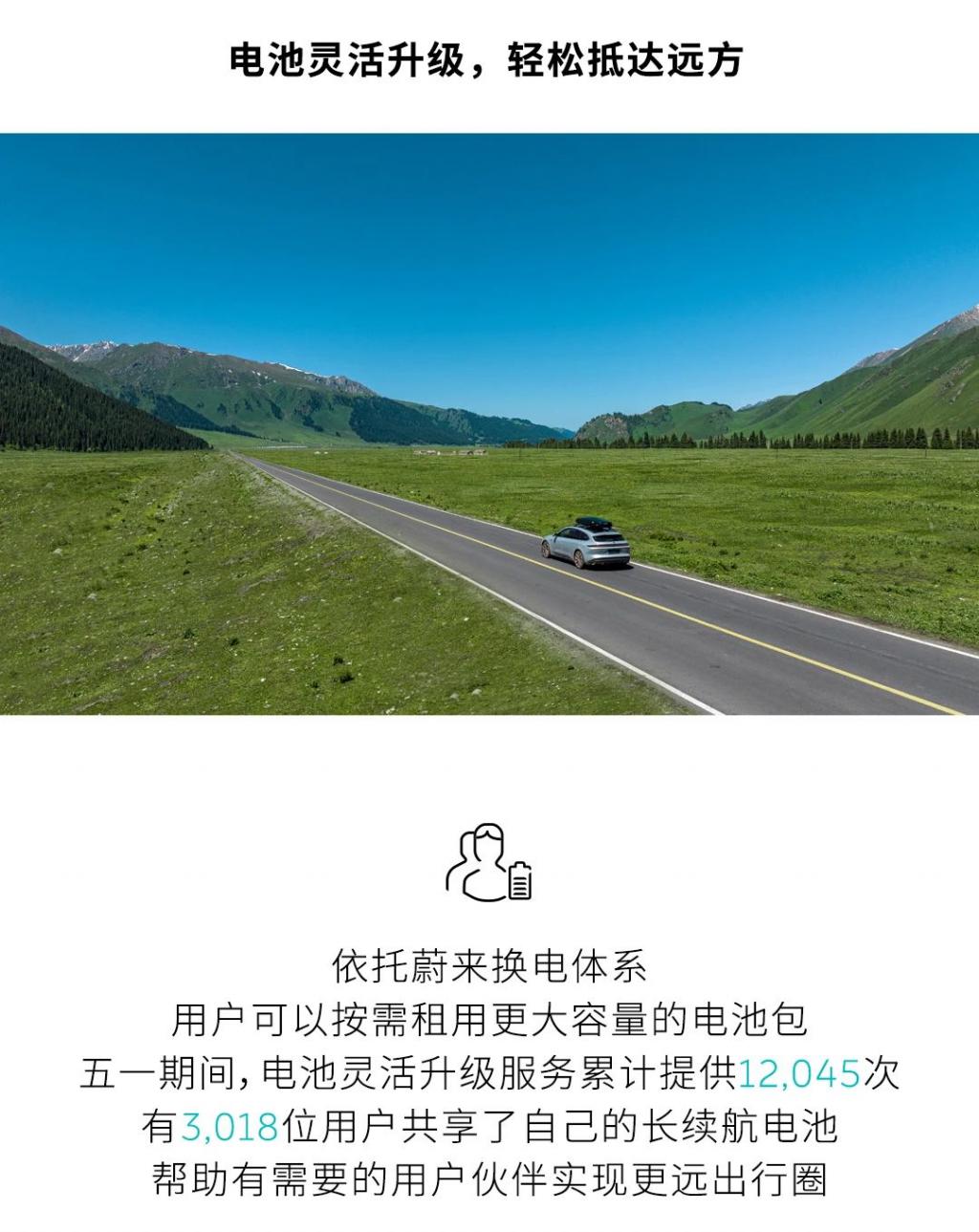 此外,蔚来还提供了 12045 次电池灵活升级服务,有 3018 位用户共享了自己的长续航电池。