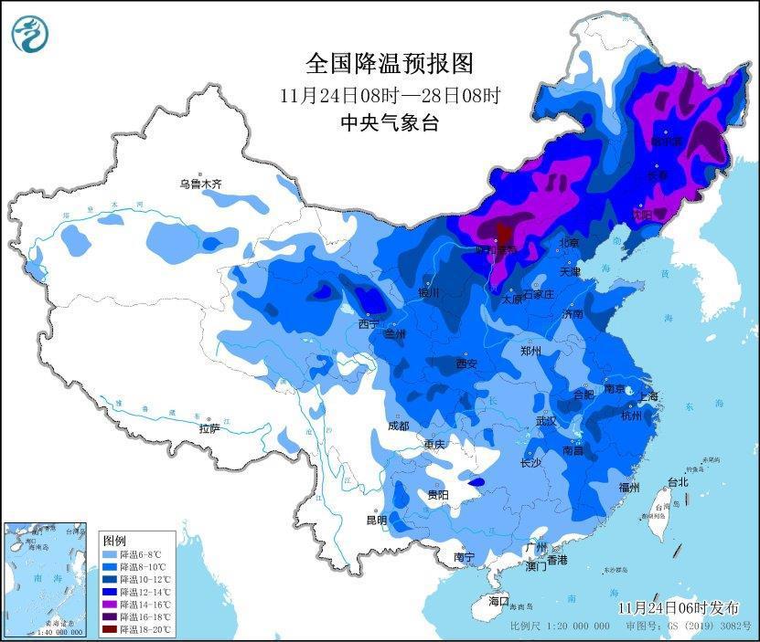 受寒潮影响,预计,11 月 24 日 08 时至 11 月 28 日 08 时,我国大部地区气温将先后下降 6~10 ℃,其中,西北地区东部、华北北部、内蒙古及东北等地部分地区降温 12~14 ℃,局地 16 ℃以上。