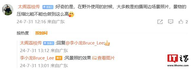 有用户在该微博评论区询问户外场景照片压缩情况,李小龙回复补充了风景照效果图片。