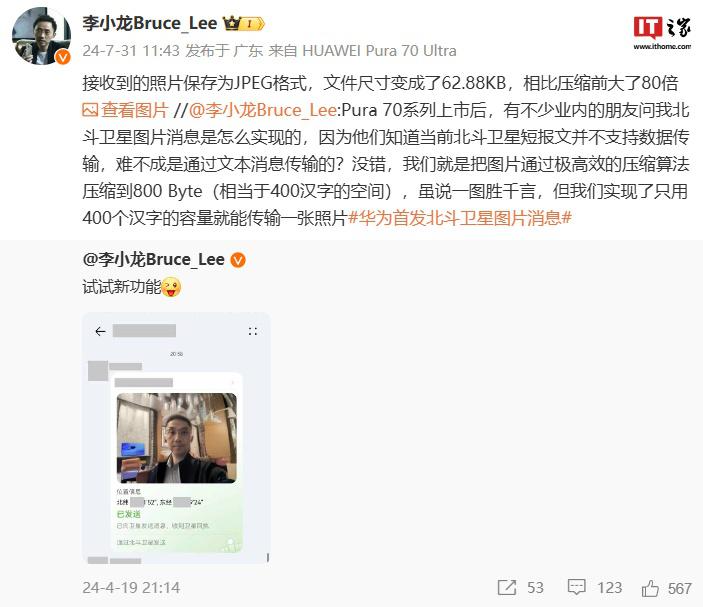 IT 之家 8 月 1 日消息,华为终端 BG CTO 李小龙今日发文揭秘北斗卫星图片消息功能原理:通过压缩算法将图片压缩,接收到的照片保存为 JPEG 格式,文件尺寸变为 62.88KB。