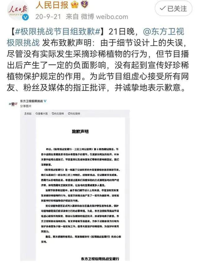 随后,节目组发布致歉声明称,没有实际发生采摘珍稀植物的行为,但节目播出后产生了一定的负面影响,没有起到宣传好珍稀植物保护规定的作用。