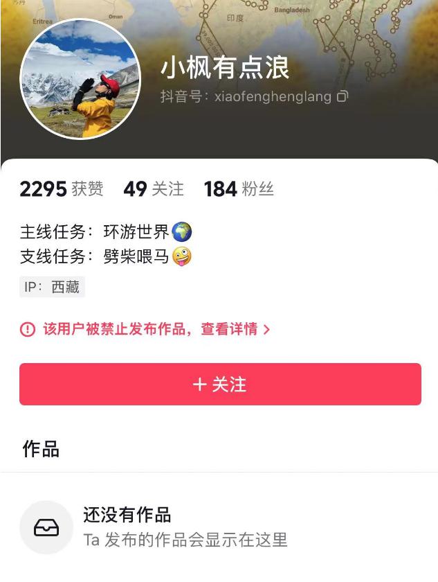 11 月 2 日,检索发现,目前 " 小枫有点浪 " 的账号已经显示为私密账号,并且因违反相关规定被禁止发布作品,将于 11 月 9 日解封。