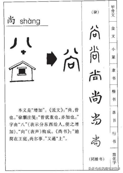 后来经过引申,“尚”逐渐与“上”的意思接近并且趋于一致,所以“尚”也有崇尚、推崇的意思在。
