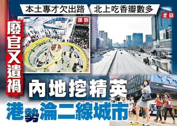 东方日报今日头版标题“内地挖精英,香港势沦为二线城市”,副题是“废官又遗祸”,“本土专才欠出路,北上吃香瓣数多”。