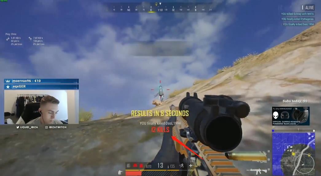 最终落入了决赛圈中,Ibiza只身一人,剩下一个三人队伍,但是他丝毫不慌,借助地形先行击倒一人,随后一发手雷过去,再次反身击倒一人,最终剩下的独狼也顶不住Ibiza,这一把Ibiza12杀成功吃鸡!