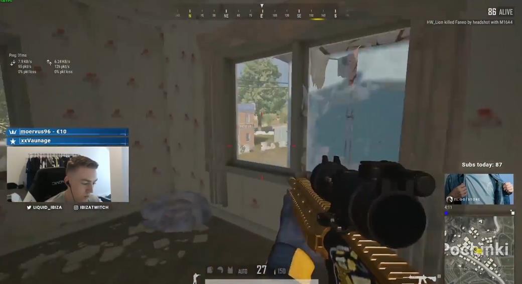 首秀很快就开始了,Ibiza也进入了自己的游戏。在这一局中,Ibiza先行跳进了房区,可能是听到了有脚步声,Ibiza选手不但没有躲避,反而是将窗户全部打破,吸引那名敌人过来。最终Ibiza发现了他,并且试图何其对点,最终锁血成功,拿下第一颗人头!