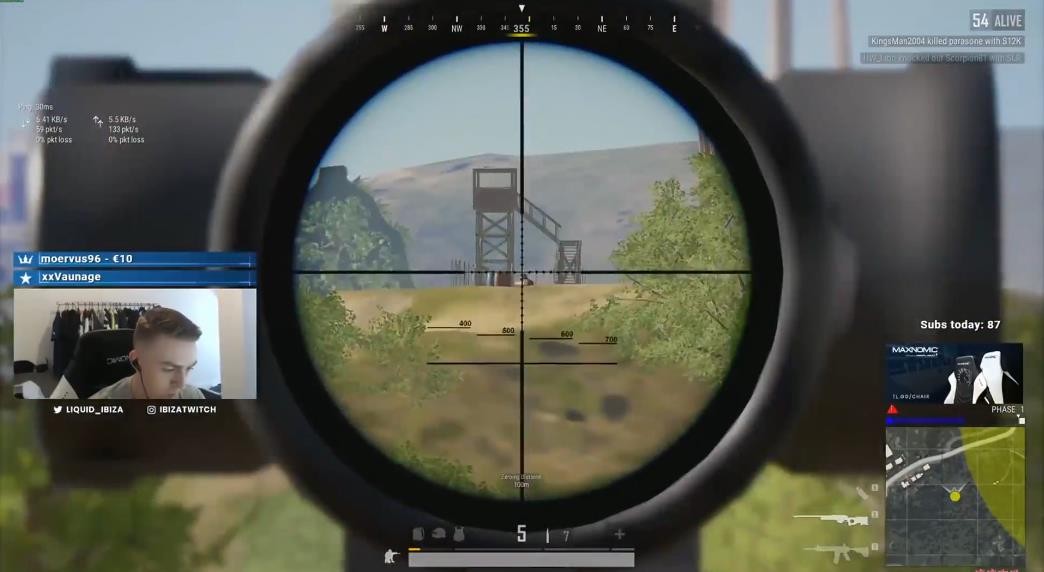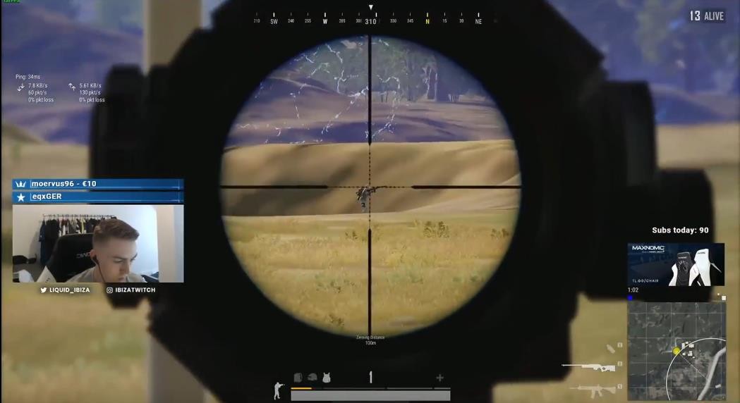 随后在搜到物资之后,Ibiza也开始去追空投了。这一个空投里面可是非常肥沃呀,不但有AWM,竟然还有15倍镜,Ibiza也是拿起了AWM。开始了自己的表演,大家都知道,15倍镜堪称天文望远镜,距离十分的难以把握,Ibiza也是抱着玩一玩的心态,但是不得不佩服其眼力,随随便便一扫就能找到人,观众们也纷纷称奇呀!