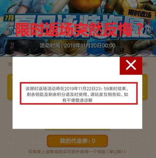 夏日泳装许愿活动时间是11月20日-11月30日,但是活动时间还没有结束官方就提前发布公告表示活动在11月22日就进行下架,并且要求玩家在活动结束之前使用完点券和积分,活动总共就上架两天,积分100才可以进行兑换,许多玩家的积分还是在活动中没有兑换出来突然下架的活动对于氪金玩家来说绝对是一大损失,并且钥匙也是全部都清空,根本不给玩家反应的的机会。