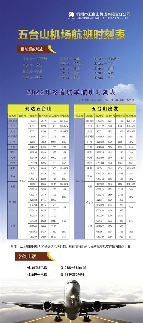 据了解,随着国内疫情防控措施的调整,五台山飞机场积极协调各航空公司加快恢复航线航班速度,积极应对航空客流快速回升的迫切需要,同时抓住即将到来的春运市场机遇,再开通昆明、沈阳、杭州、哈尔滨四个新航点。至此,五台山机场共开通航线25条,通航城市达到22个。