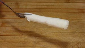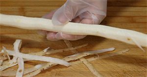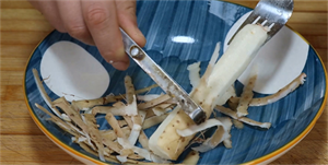 第2个方法就是用叉子先插进山药里面。在用叉子叉山药的时候要擦得紧一点,深一点,否则山药容易脱落。叉子插进山药中之后咱们用一只手拿着叉子,另一只手削皮,这样削皮也非常方便,非常快捷。而且这样削完外皮之后叉子还能继续再用,不像第1种方法一样,还要将手套丢掉。