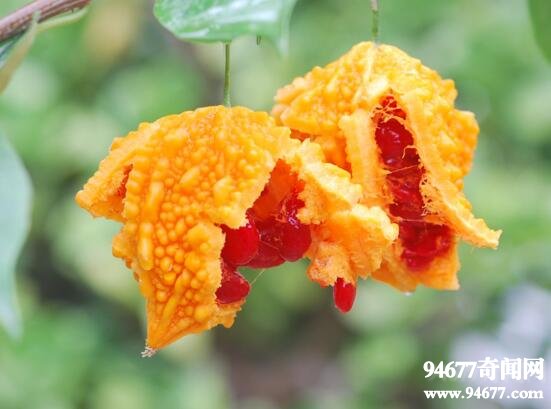 长不超过 10厘米。果实纺锤形,有瘤状凸起,成熟时橙黄色,味苦,瓤鲜红色,味甜。嫩果是绿白色,成熟时呈白色,后熟果是橘红色,嫩果或老果均可食用。