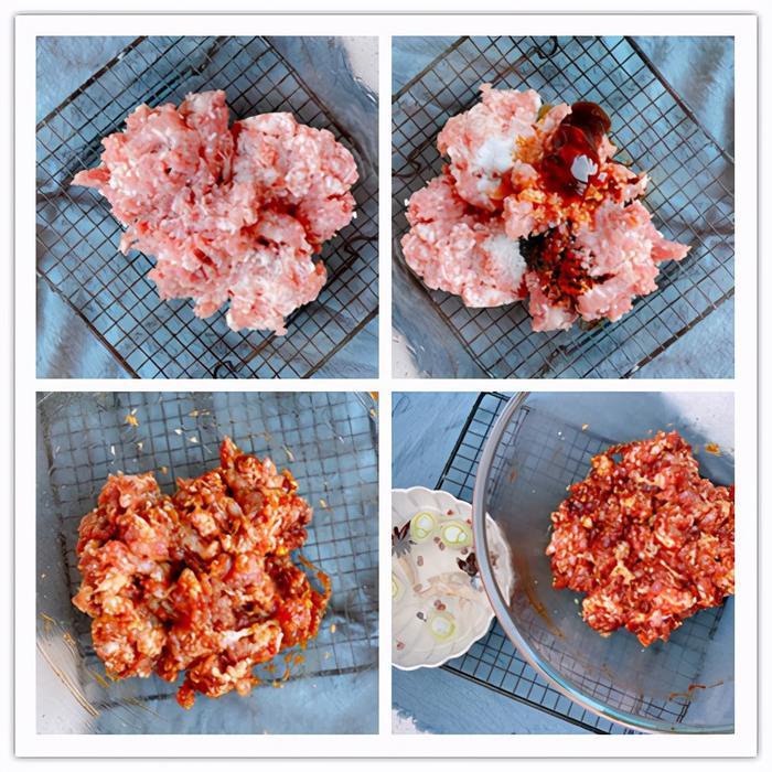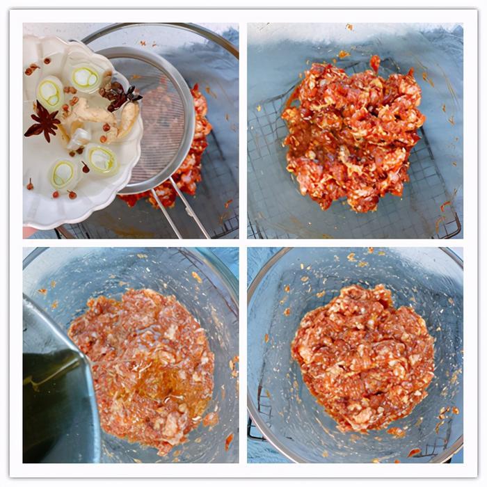 5、萝卜在杀水分的时候先来调制肉馅,肉馅我用的是二肥八瘦的,准备好的猪肉馅中加入食盐、生抽、老抽、蚝油、白糖,搅拌均匀,搅拌好之后再加水,少量多次的加入花椒水,每次都充分搅拌均匀之后再加入下一次,500g肉馅大约需要150g花椒水,花椒水调好之后加入少许食用油,锁水保鲜,搅拌均匀就可以了;