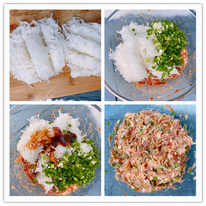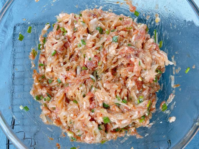 7、把挤干水分的萝卜丝浅浅的切上几刀,放在肉馅中,加入葱花、再加入适量的香油调香,还能锁住水分,这样后续就不会出现馅料出水的问题了,搅拌均匀,萝卜丝肉馅就调好了;