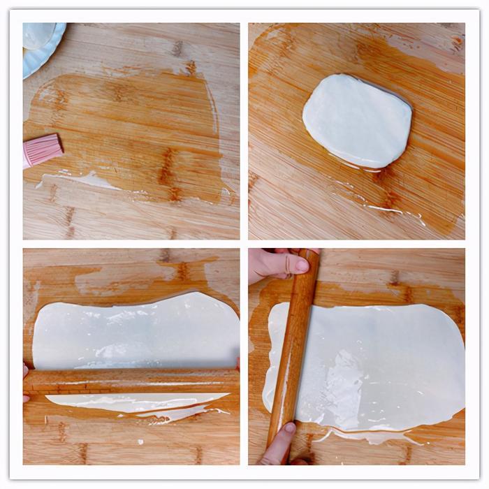 8、馅料准备好之后再处理面团,在案板上刷上少许食用油,取一个面剂子,放在案板上,用手将它拉长,压扁,用擀面杖擀成一个长方形的面皮,面团的饧面时间足够,这个面皮会很好操作,一下子就能擀成薄薄的面皮;