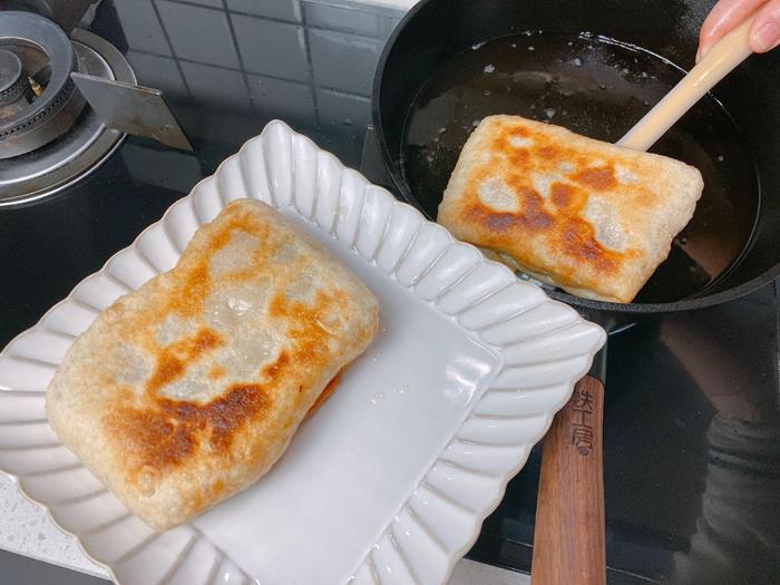 10、平底锅预热,加入食用油,放入做好的萝卜丝馅饼,小火慢慢烙,烙到底面变色,翻面,烙的过程中要勤翻面,烙到两面金黄就能出锅了;