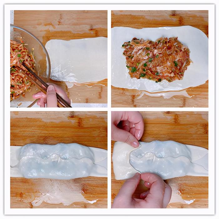 9、在擀好的面皮中间铺上一层馅料,整理成方形,然后先将上下两边向中间折叠,再把左右两边也向中间折叠,这样一个萝卜丝馅饼就做好了;