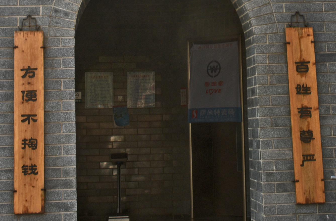 成都北门大神庙公厕门口贴有一副对联: