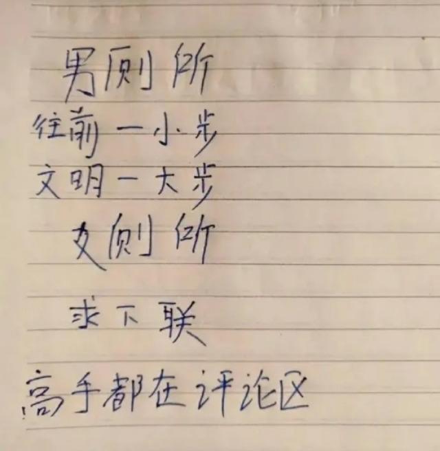 男厕所:往前一小步,文明一大步!女厕所:求下联?高手在评论区