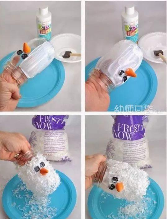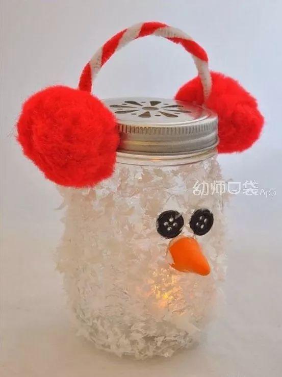 在玻璃瓶外滚上一层仿真雪,用纽扣、粘土、毛球、毛根装饰一下,一个超可爱的玻璃瓶雪人就完成啦~ 机智的你还可以在玻璃瓶里放个小灯,这样在黑夜中也能看到闪闪发光的雪人呢!