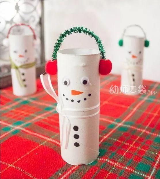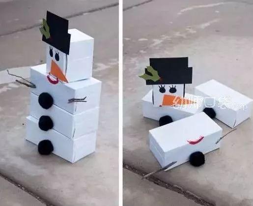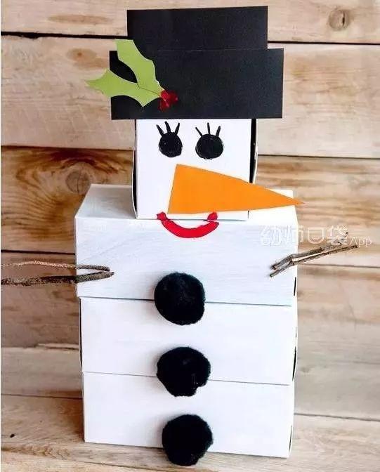 看着俏皮的雪人,既可以放在大厅里做装饰,又可以拿来做投掷游戏,制作起来也不是那么复杂,只需要准备几个纸盒并将它涂成白色,再装饰一下就完成了。