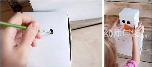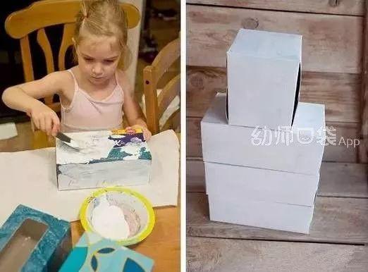 准备材料:若干纸盒、白色颜料、彩色卡纸、毛球、树枝等