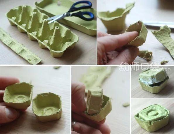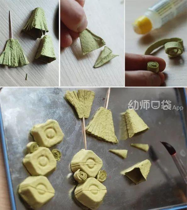 准备材料:鸡蛋托、颜料、毛根、牙签、活动的眼睛等