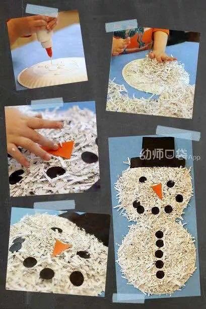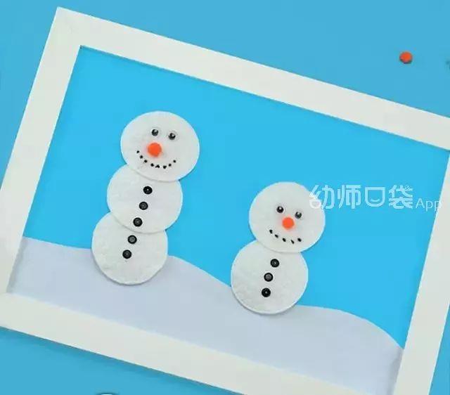 这款雪人制作简单,非常适合小班的孩子~只需要将圆形化妆棉层层粘在纸上,用纽扣、毛球等进行点缀,就完成了。