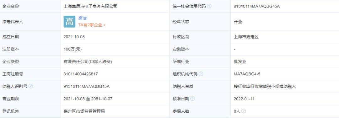 企查查数据显示,嘉尼诗成立于2021年。