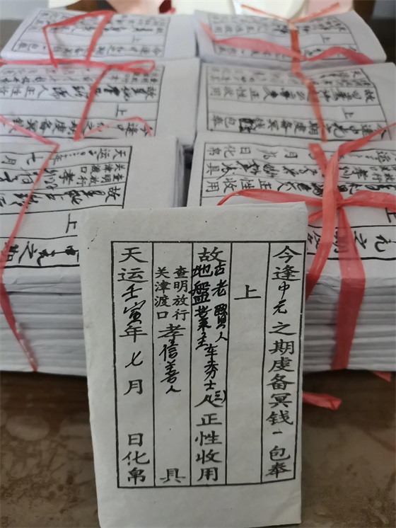 袱子一般采用白纸作外封皮里面包黄纸。按照个数6个袱子为半贯,12个袱子一贯、24个为两贯,一般不超过24个。另外还需要包一个地盘业主袱子。