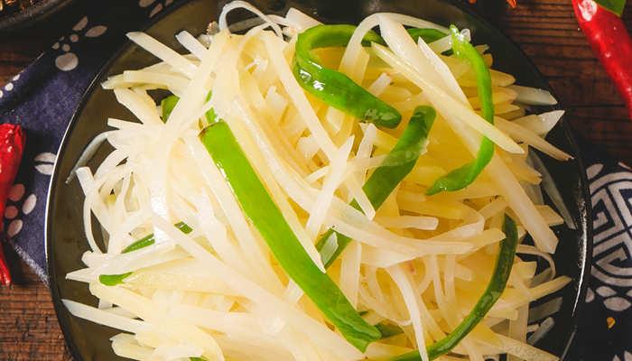 1、土豆去皮洗净切丝,青椒洗净去籽切丝。